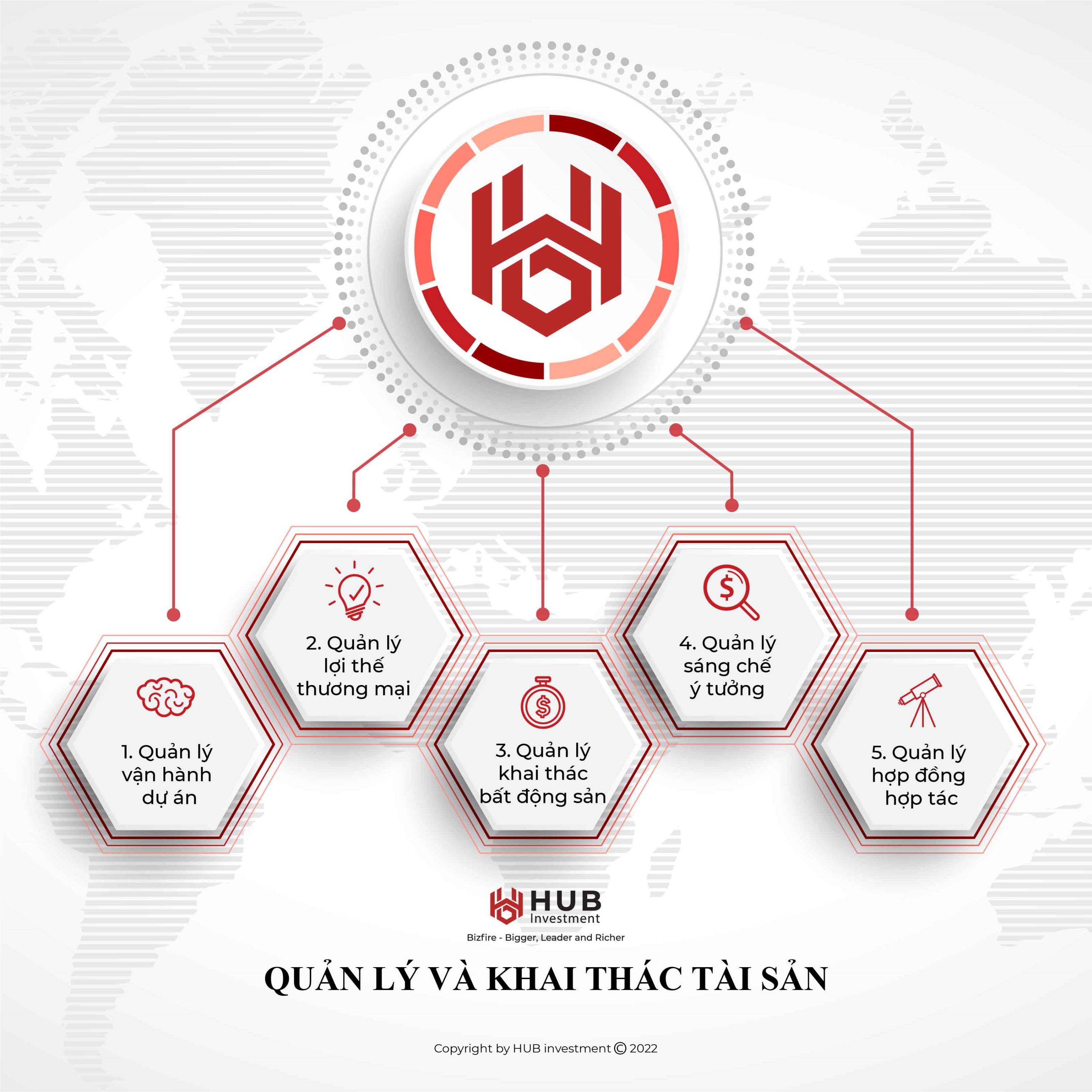 HUB nhìn thấy tiềm năng khai thác tài sản của thị trường với nhiều kênh thông tin từ những mối quan hệ tin cậy với các brand lớn và hiểu rõ nhu cầu của thị trường. Do đó HUB có thể cung cấp các giải pháp cụ thể cho cá nhân, tổ chức về những thách thức khai thác tài sản với một thị trường nhiều lúc rất khó làm, khó đoán như hiện nay. Cách tiếp cận của chúng tôi là khác biệt và hoàn toàn độc lập, chúng tôi thích nghi và linh hoạt với thị trường để tìm được phương án tốt nhất cho khách hàng của mình.